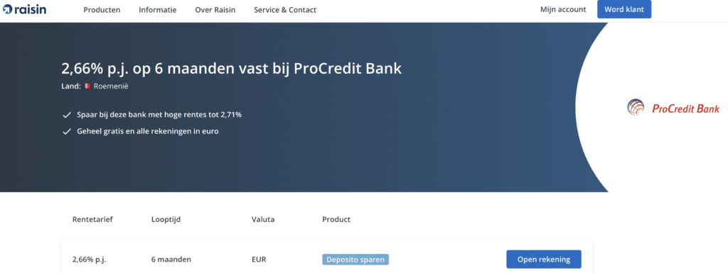 Het openen van een ProCredit Bank deposito gaat dus via Raisin. Raisin is een bemiddelaar. Zonder deze bemiddelaar kun je deze spaarrekening als buitenlander niet openen.