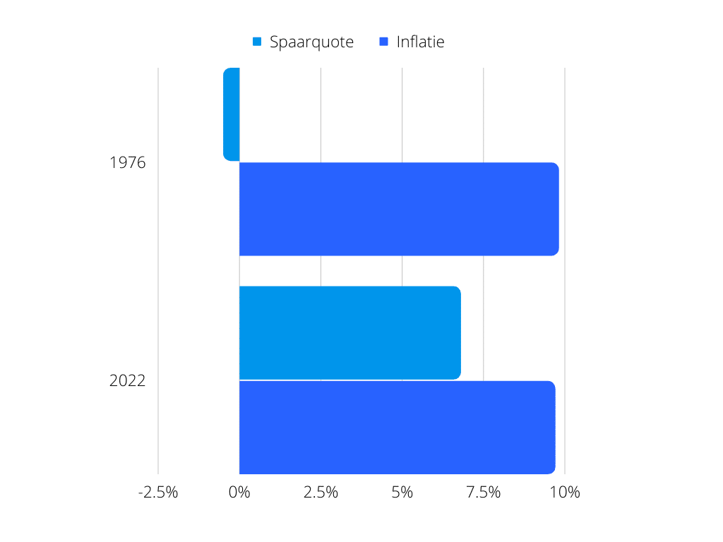 De financiële buffers van de gemiddelde Nederlander (nee, niet van iedereen) zijn nu groter dan in 1976. De particuliere spaarquote was toen zelfs negatief en is nu met bijna 7% heel gezond. Dat geldt ook voor het bedrijfsleven. De inflatie is momenteel 9.7% en was in 1976 9.8%.